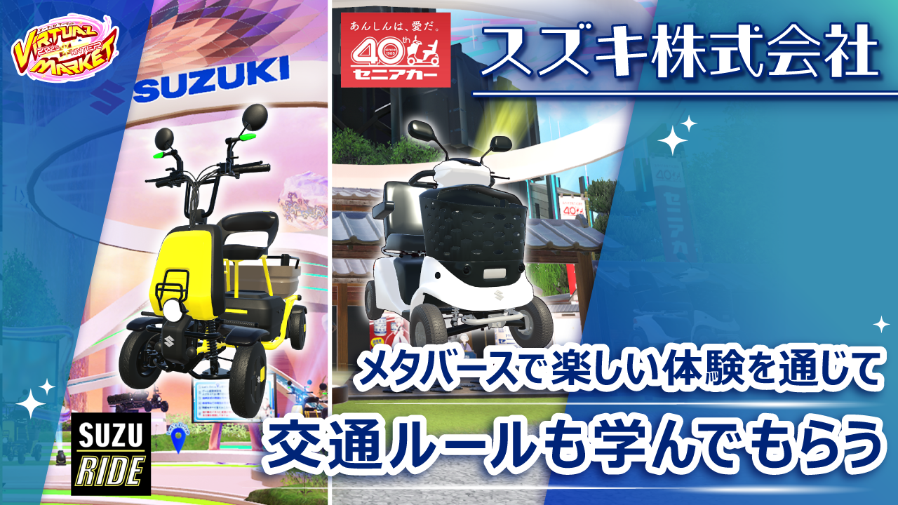 高齢化・交通格差などの社会課題解決に向け、様々なモビリティの開発に取り組んでいるインフラモビリティメーカーのスズキは、若年層への認知拡大を目的に、パーソナル電動モビリティ「スズライド2」と、発売40周年を迎えた電動車いす「セニアカー」を紹介する2ブースを、バーチャルマーケット2025 Winterにて初出展いただきました。